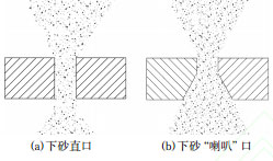 1、將下砂孔適度拓寬,由8 mm 拓寬至12 mm,同時將下砂口結構形式由直口改成喇叭口形狀,使砂子不易粘附,不易在下砂口板結堵塞,不僅解決了下砂不流暢的問題,使生產節奏恢復正常,而且取得了良好的效益。如圖所示: