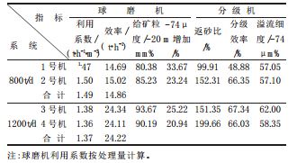 (2)磨礦工況差異較大。由于當班原礦供應充足,基本杜絕了斷礦,保證了球磨機的給礦均衡穩(wěn)定,同型號球磨機的臺時效率接近。但球磨機排礦中-74μm含量差異較大,高為1號機34.86%,低為4號機23.15%。