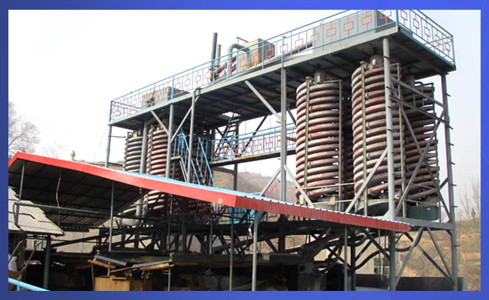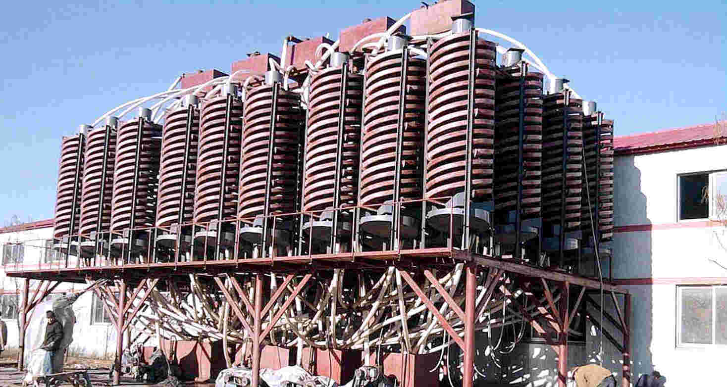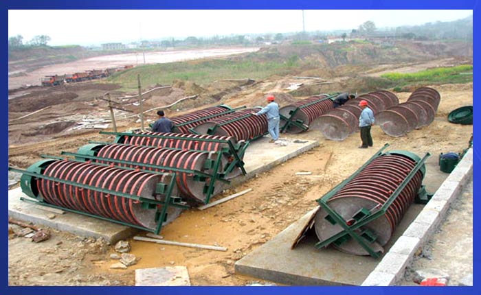 將螺旋溜槽立起,校準垂直線,用鐵架或木頭固定在合適的位置,由砂泵將礦砂送到螺旋上頂兩個進料口處,加入補充水,調節礦槳濃度,礦槳自然從高往下旋流,在旋轉的斜面流速中產生一種慣性的離心力,以礦砂的比重、粒度、形狀上的差異,通過旋流的重力和離心力的作用,將礦與砂分開,精礦流入精礦斗用管道接出,尾砂流進尾砂斗用管道接到砂池,再用砂泵排走,完成了選礦的全過程。